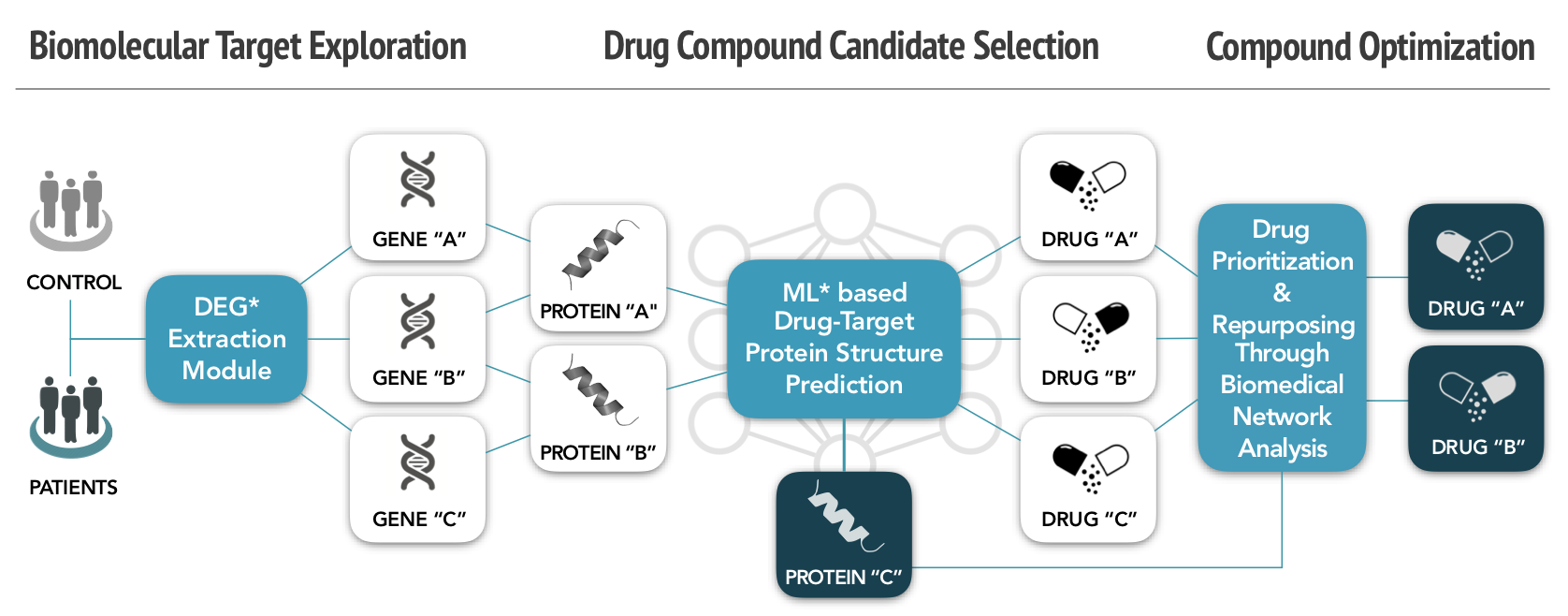 Our project explores biomolecular targets to aid development, selects drug candidates, and recommends compounds as optimized drugs. To do this, we construct a genomic NGS data analysis pipeline of patients while building semantically enriched bio-omics network data for gene-protein- drug interactions.